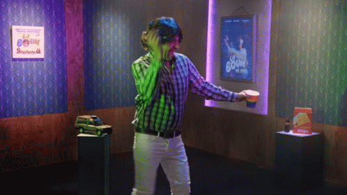 Man in plaid shirt dancing at a vibrant La Boum Kulfaz party, surrounded by retro decor.
