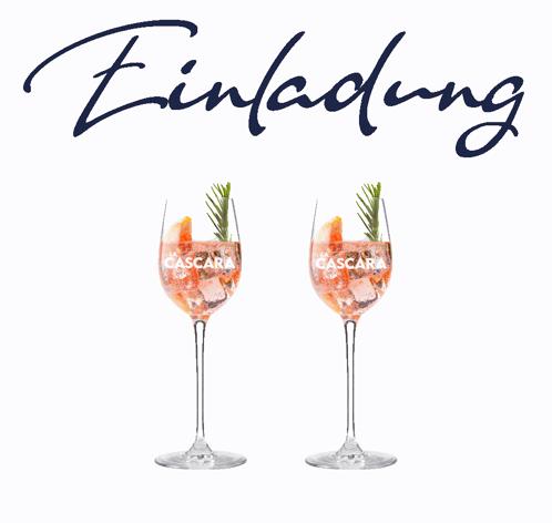 An invitation for La Cascara featuring two elegant glasses of aperitif with fruit and herbs.