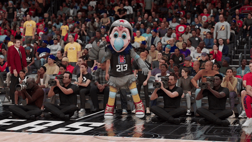 LA Clippers mascot Chuck The Condor entertains the crowd with a lively dance on the basketball court.