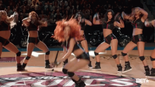 The LA Devil Girls Dancers perform a dynamic routine on a basketball court, showcasing energetic moves.