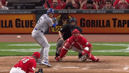 Freddie Freeman of the LA Dodgers batting during a baseball game, with a pitcher and catcher in action.