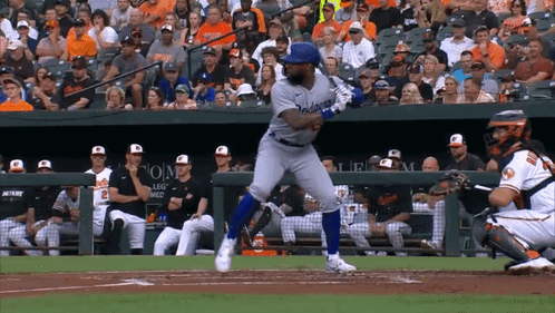 Jason Heyward, a Los Angeles Dodgers player, powerfully swings his bat during a baseball game.