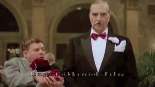 A scene from Italian comedy featuring two men, one in a tuxedo and one in a bow tie.