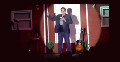 A man performs on stage with a microphone, a guitar visible nearby, addressing the audience.