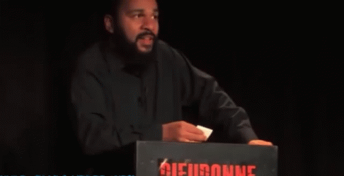 French comedian Dieudonné M'bala M'bala laughing heartily during a performance.