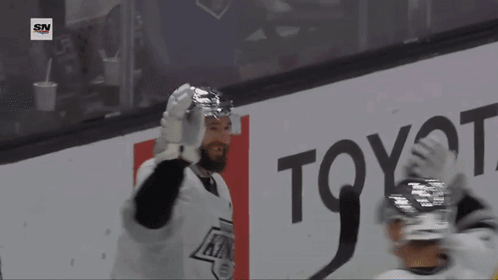 Drew Doughty, a Los Angeles Kings hockey player, stands on the ice in front of a Toyota advertisement.