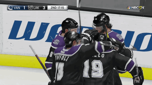 LA Kings players, including Drew Doughty, celebrate a goal during a hockey game against Vancouver.