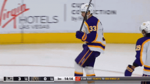 Viktor Arvidsson (number 33) celebrates a goal with his LA Kings teammates during a hockey game.