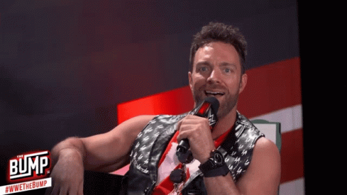 LA Knight, also known as Eli Drake, speaks into a microphone during an appearance on WWE's 'The Bump'.