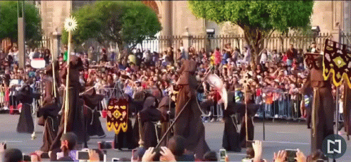 Solemn parade featuring figures dressed as 'La Muerte Monjes' or death monks, observed by a large crowd.