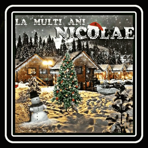Animated Christmas card featuring a snowman, decorated tree, and festive houses, wishing 'La Multi Ani Nicolae'.
