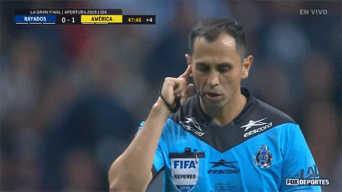 A referee listens to his earpiece during the Liga MX Apertura 2019 Grand Final between Rayados and América.