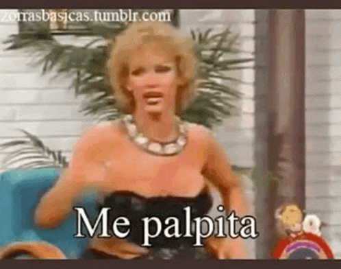Woman in black dress dramatically repeats 'Me palpita, La pepita' in a classic meme-like clip.