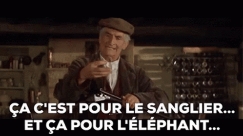 Guerrin, played by Louis de Funès, explains his hunting strategy for wild boar and elephant with a rifle.