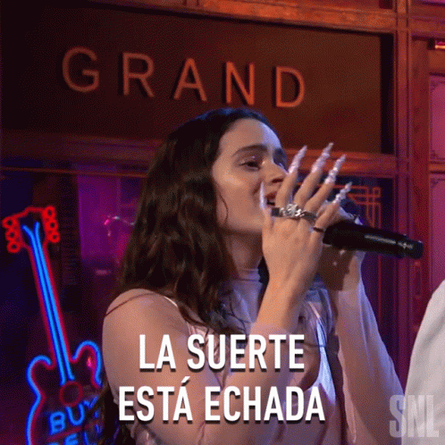Rosalía performs 'La Suerte Está Echada' on stage, singing into a microphone with long, decorative nails.
