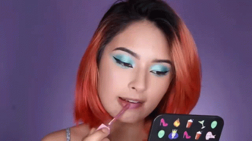 Laura Sanchez applies a pink liquid lipstick, completing her vibrant makeup look with blue eyeshadow and winged eyeliner.