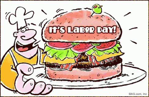 A cheerful cartoon chef celebrates Labor Day with a giant hamburger, inviting viewers to 'Party Your Buns Off!'