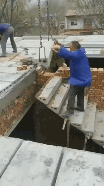Two construction workers carefully install heavy concrete slabs using a crane on a building site.