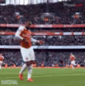 Alexandre Lacazette performs his signature 'Lacadance' celebration on the football field.