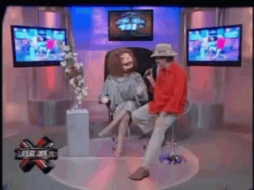 Lacomay and an interviewer on the set of the 'Lacomay Bochinche' TV show, discussing gossip.