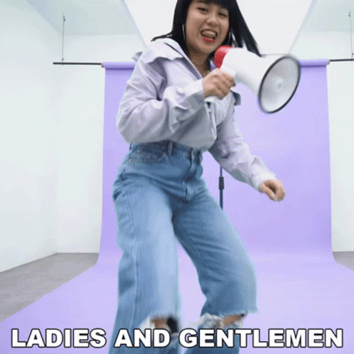 Ghea Indrawari holds a megaphone, announcing 'Ladies And Gentlemen' in a studio setting.
