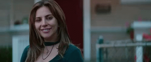 Lady Gaga smiles sweetly, wearing a choker necklace, from her role in A Star Is Born.