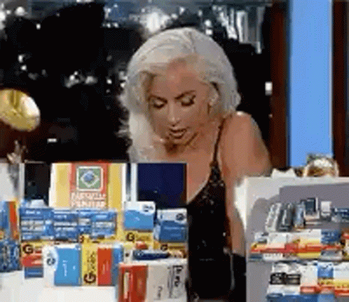 Lady Gaga, in a black dress, laughs and reacts with a trophy on a talk show set, surrounded by products.