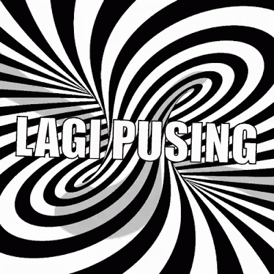A black and white optical illusion with 'Lagi Pusing' (feeling dizzy) text, creating a hypnotic, spinning vortex.