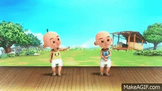 Upin and Ipin dancing cheerfully to their theme song in an outdoor setting.