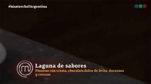 A delicious 'Laguna de Sabores' dessert from Masterchef Argentina, featuring pionono with cream, chocolate, dulce de leche, peaches, and cherries.