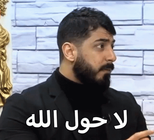 Ismaeil Tamr expresses dismay, wearing a black suit and turtleneck, saying 'There is no power except with Allah'.
