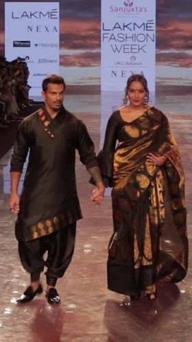 Models walk hand-in-hand on the runway at Lakme Fashion Week, showcasing traditional Indian attire.