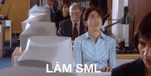 Tamsin Greig, as Fran Katzenjammer, working hard at a desk with 'working hard' text on screen.