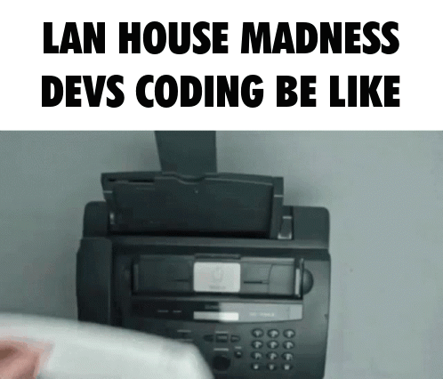 A humorous meme showing 'LAN HOUSE MADNESS DEVS CODING BE LIKE' with a hand feeding paper into a fax machine.