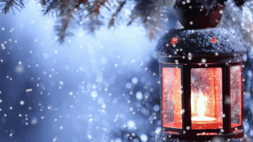 A cozy red lantern with a lit candle, covered in snow, hanging from a pine branch during a winter snowfall.
