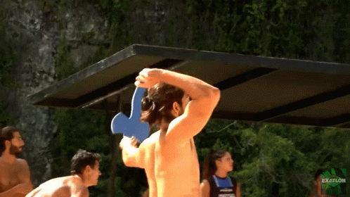 Athlete throwing an axe in the Exatlón competition, aiming for the target in a competitive sports challenge.
