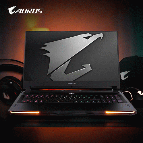 An AORUS gaming laptop displays various game titles, featuring vibrant RGB lighting and a sleek design.