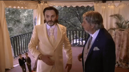 Fermín (Fernando Tejero) and Vicente (José Luis Gil) from La que se avecina attend a wedding, one in a white suit, the other in blue.