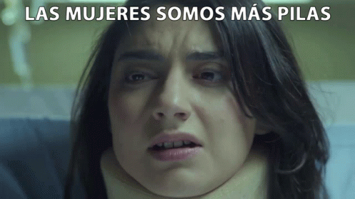 Woman with a neck collar and intense expression, with the Spanish caption 'Las Mujeres Somos Mas Pilas' displayed.