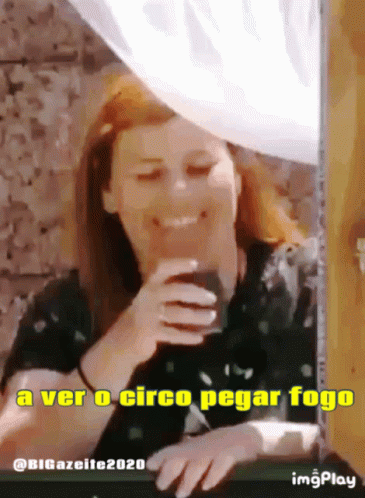 Noélia from Big Brother Portugal laughing and drinking, with a Portuguese caption 'a ver o circo pegar fogo'.