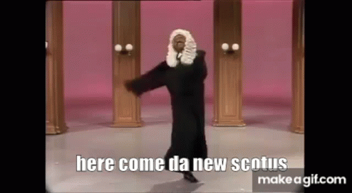 A person dressed as a judge dances energetically on a stage with the caption "here come da new scotus".