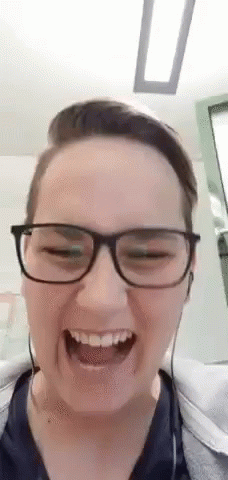 Orkat laughing with her mouth wide open, wearing glasses and headphones, capturing a moment of pure joy.