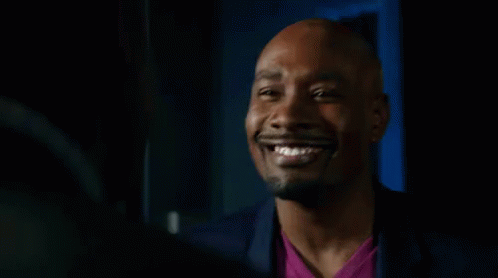 A man, possibly the character Rosewood, laughs heartily while wearing a suit and purple shirt.