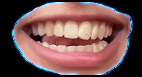 An animated mouth with bright white teeth smiles and laughs, outlined with a glowing blue light.