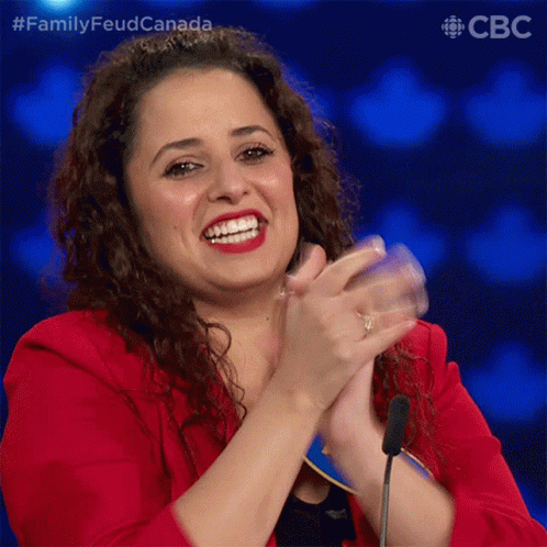 Alison from Family Feud Canada laughs and claps enthusiastically, wearing a vibrant red jacket.
