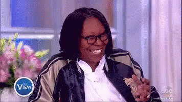 Whoopi Goldberg laughing hysterically on The View, wearing glasses and a black and gold bomber jacket.