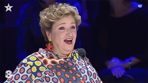 Mara Maionchi, a judge on Italia's Got Talent, laughs heartily while standing at a microphone.