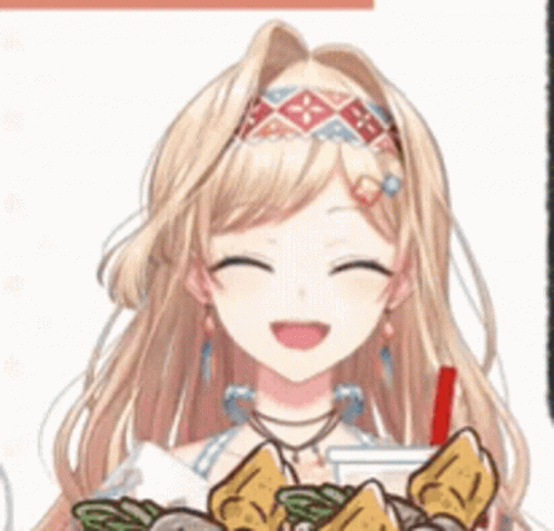 Layla Alstroemeria, the Nijisanji VTuber, smiles happily while holding a drink and a plate of delicious food.