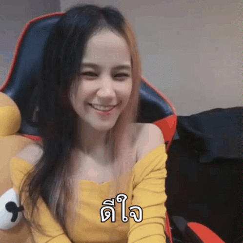 A woman with split-dyed hair smiles happily in a yellow top, sitting next to a teddy bear.