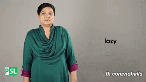A woman demonstrates the sign for 'lazy' in Pakistan Sign Language, with the word displayed on screen.